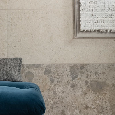 Carmen Tiles – Warm, earthy stone and terrazzo-look tiles perfectly paired for elegant indoor spaces.