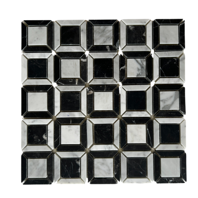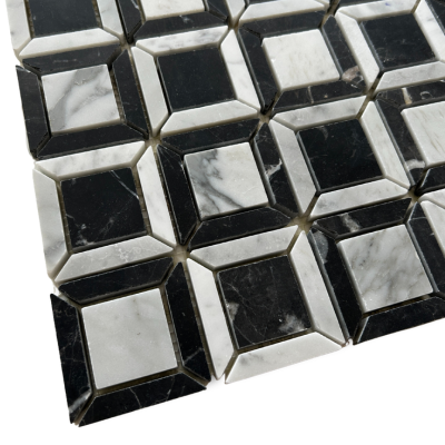A sophisticated fusion of bold geometry and timeless materials, Rossi is a premium marble mosaic that pairs Nero Marquina and Carrara Gioia in striking contrast.