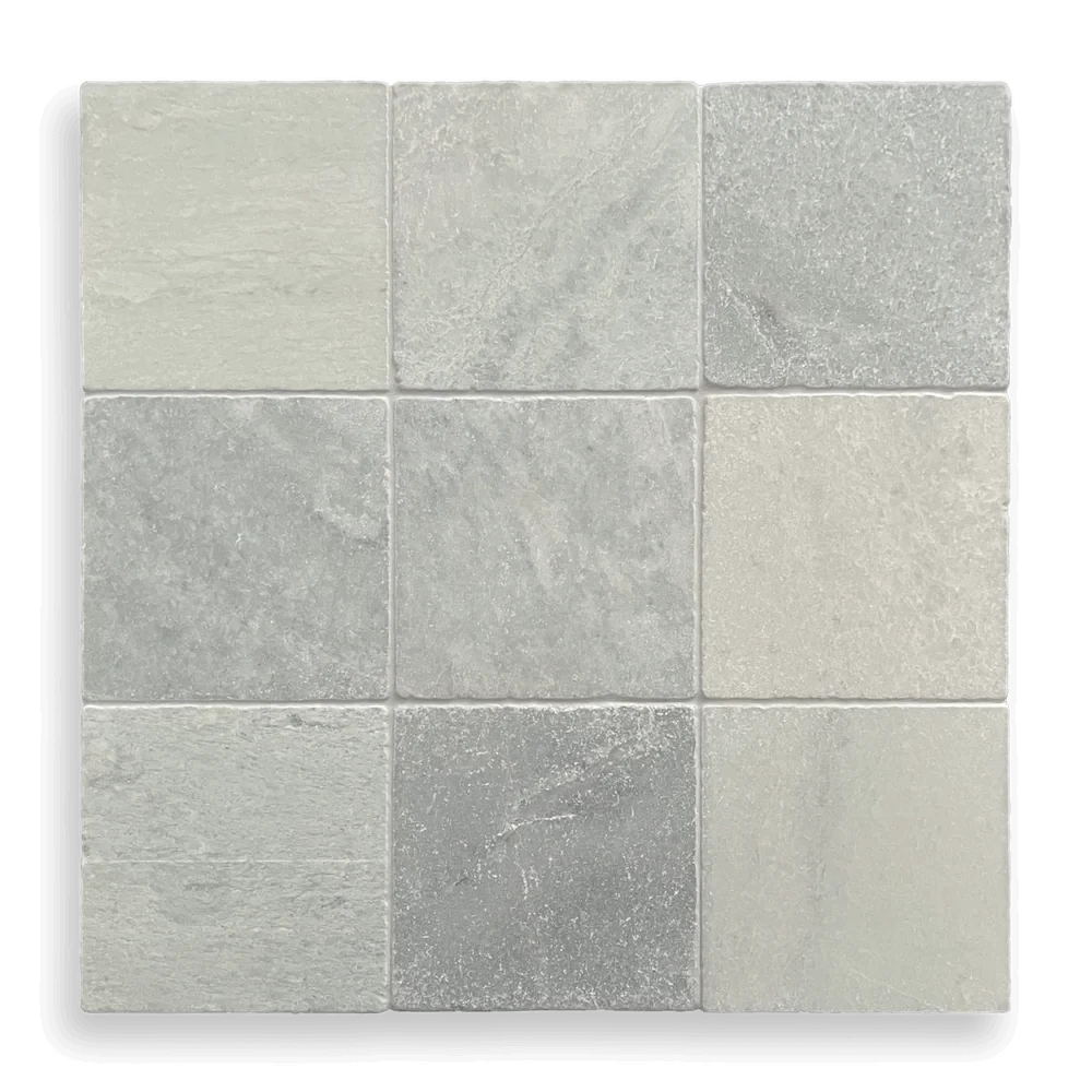 The Elementa Tumbled Verdi Cristallo tiles highlight the dramatic beauty of green marble, with deep tonal variation and intricate veining. Finished with softly worn, tumbled edges, they bring an aged, organic character that feels timeless and authentic.